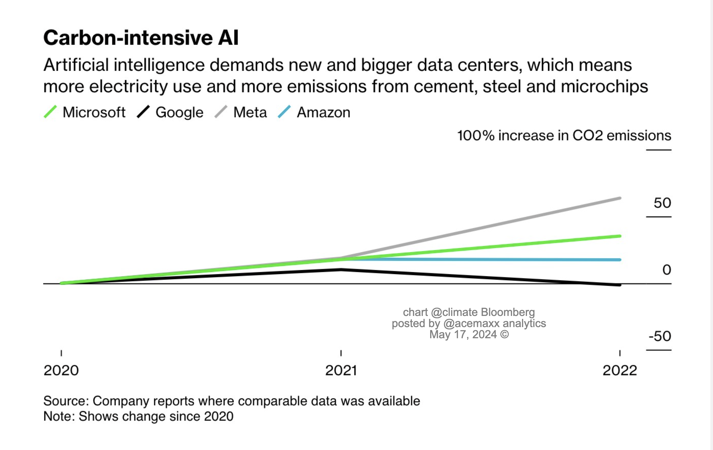 #MSFT #Microsoft’s #AI push imperils #ClimateGoal as #carbon #emissions jump 30% The company’s goal to be carbon negative by 2030 is harder to reach, chart @climate https://www.bloomberg.com/news/articles/2024-05-15/microsoft-s-ai-investment-imperils-climate-goal-as-emissions-jump-30