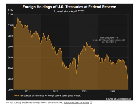 The latest @NewYorkFed breakdown of UST 'custody' holdings on behalf of foreign CBs, is revealing - #custody holdings last week stood at $2.85 trillion, the lowest since April 2020, chart @reuters.com https://www.reuters.com/markets/rates-bonds/em-central-banks-cool-treasuries-stoking-bond-yield-heat-mcgeever-2025-01-16/