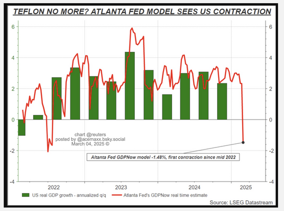 After a sweep of soft US economic indicators in Febr, the Atlanta Fed’s closely watched #GDPNow model updated on Friday to show an alarming 1.48% #contraction of the economy, chart @reuters.com https://www.reuters.com/markets/global-markets-wrapup-1-2025-03-03/
